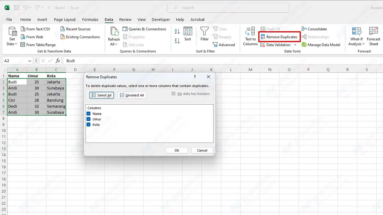 - Mit dieser Funktion können nur Duplikate entfernt werden, die identisch sind, mit Ausnahme von Duplikaten, die Unterschiede in Groß- oder Kleinbuchstaben, Leerzeichen oder Satzzeichen aufweisen. Beispielsweise werden “Budi” und “budi” von dieser Funktion nicht als Duplikate betrachtet. Wenn Sie Duplikate mit diesen Unterschieden entfernen möchten, müssen Sie einige zusätzliche Schritte ausführen, z. B. “UPPER”, “LOWER” oder “TRIM” Formeln, um das Format Ihrer Daten auszugleichen, bevor Sie “Remove Duplicates” Funktion verwenden.