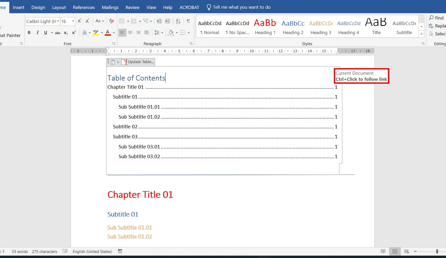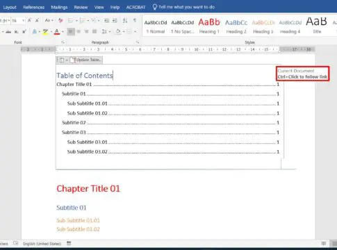 - Der Vorteil der Verwendung eines Inhaltsverzeichnisses auf diese Weise ist, dass es eine Verbindung vom Inhaltsverzeichnis zum Inhalt des Dokuments gibt. Um zum Titel oder Untertitel des Dokuments zu gelangen, drücken Sie einfach „Strg“ auf der Tastatur und klicken auf den Titel oder Untertitel im Inhaltsverzeichnis.