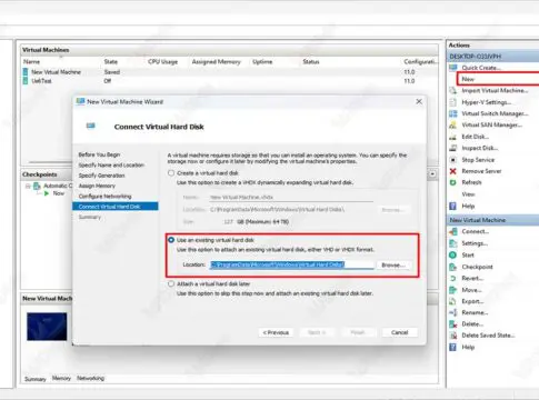 - Befolgen Sie die Anweisungen des Assistenten, um eine neue virtuelle Maschine mit Spezifikationen zu erstellen, die mit der ursprünglichen physischen Maschine übereinstimmen. Wählen Sie auf der Seite “Connect Virtual Hard Disk” die Option “Use an existing virtual hard disk” aus, und navigieren Sie zu der Datei der virtuellen Festplatte, die Sie zuvor kopiert haben.