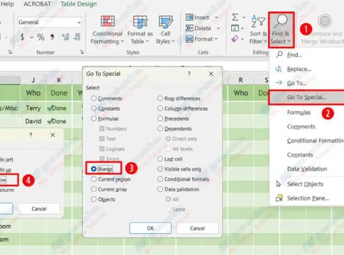 - Wählen Sie im Dialogfeld “Go To Special” die Option “Blanks” aus, und klicken Sie dann auf OK. Excel markiert alle leeren Zellen, die sich in Ihrem Arbeitsblatt befinden.
