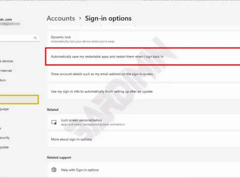 - Navigieren Sie dann im Fenster Einstellungen zu „Konten > Anmeldungsoptionen“. Scrollen Sie im rechten Bereich nach unten und suchen Sie nach „Automatically save my restartable apps and restart them when I sign back in“. Schieben Sie dann die Schaltfläche nach links, um diese Funktion zu deaktivieren.