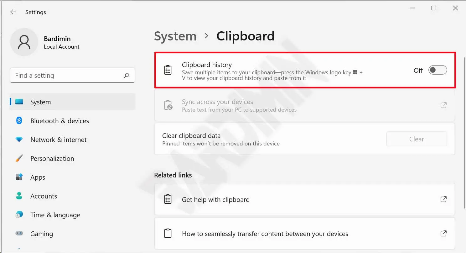 Um den Verlauf der Zwischenablage zu deaktivieren, öffnen Sie „Settings“ mit der Taste (Strg + I). Wählen Sie dann „System > Clipboard“. Wählen Sie im rechten Fenster „Clipboard History“ und schieben Sie den Schalter daneben nach links, um ihn zu deaktivieren.