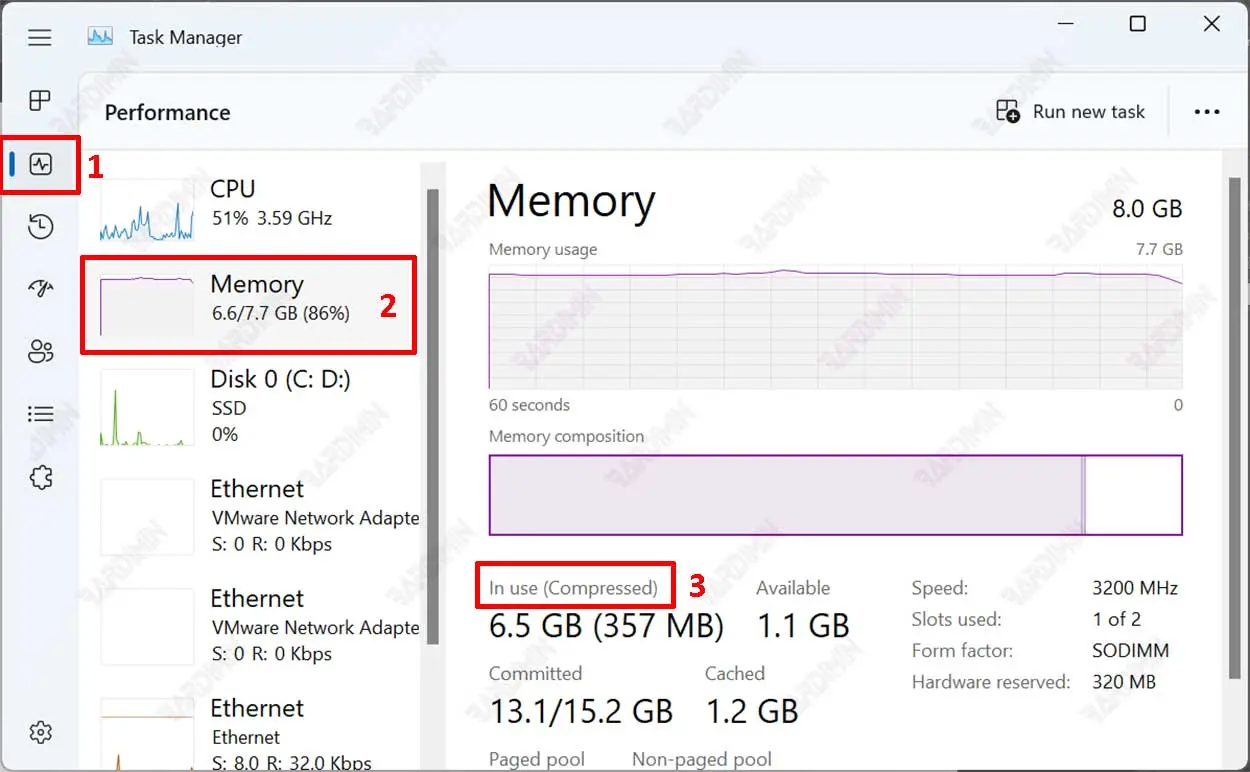 - Next on the right pane, look at the memory usage status on “In use“. If it is “Compressed“, it means that Memory Compression is “Active“.