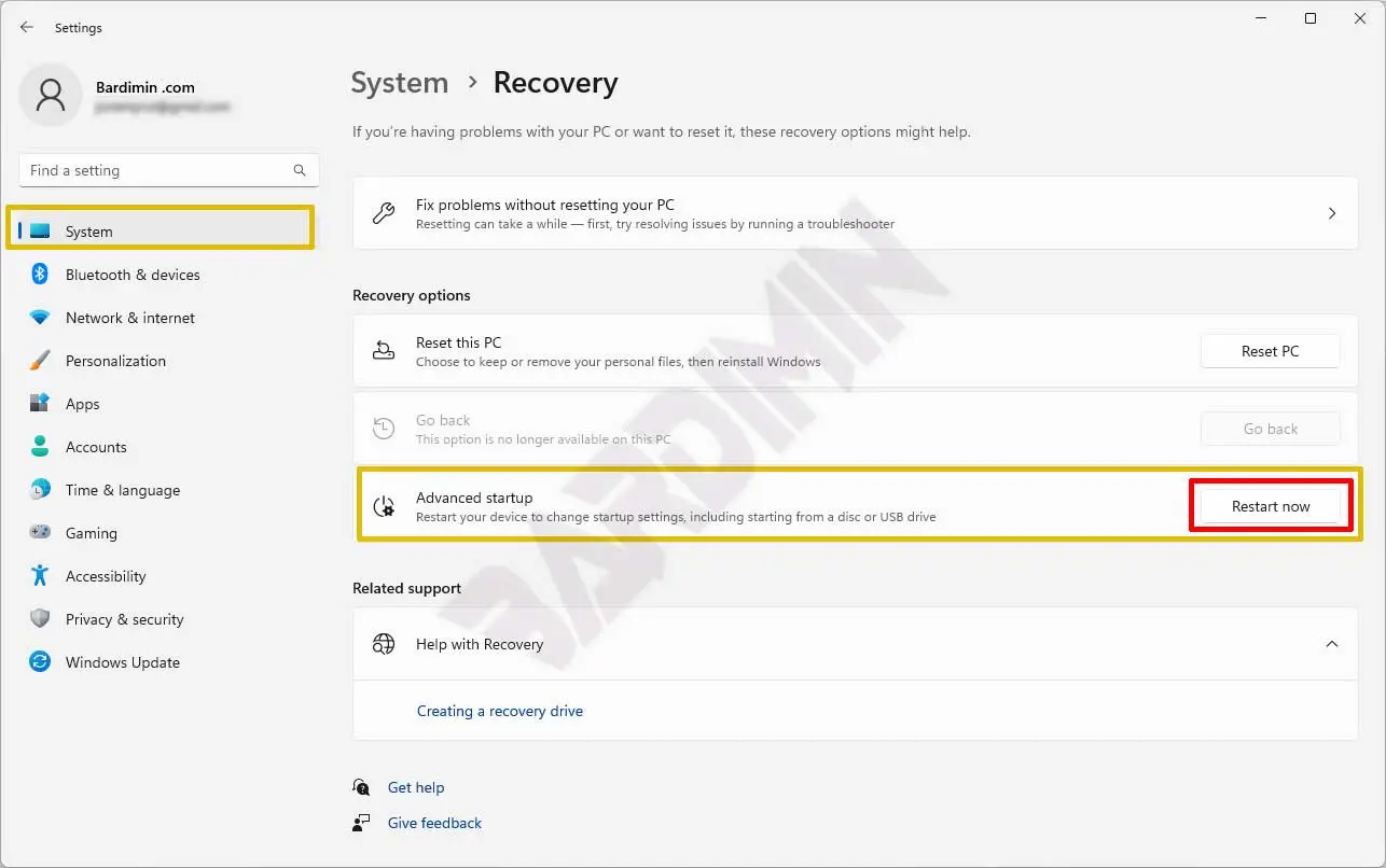 - Then select “Systems > Advanced startup“. Next, click on the “Restart now” button next to it. The PC will restart.