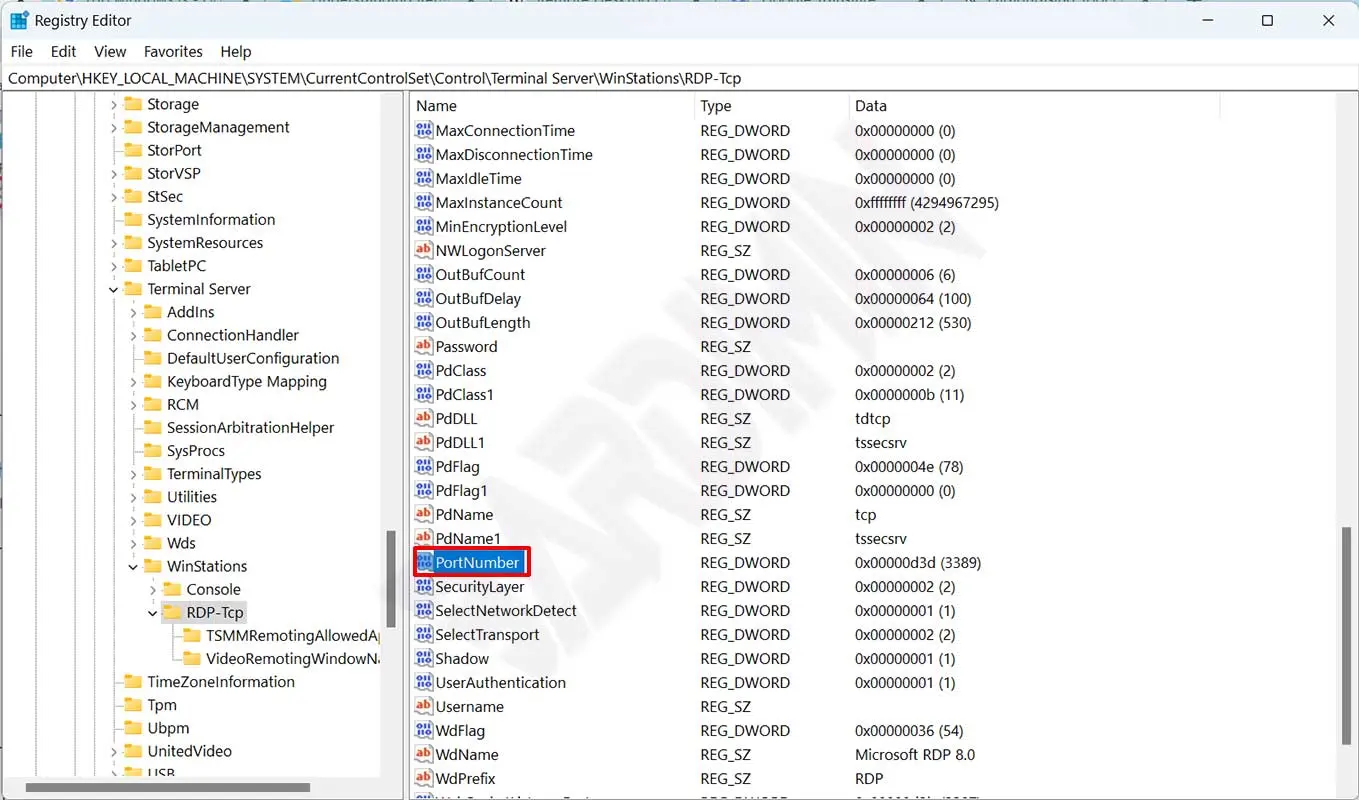 Computer\HKEY_LOCAL_MACHINE\SYSTEM\CurrentControlSet\Control\Terminal Server\WinStations\RDP-Tcp