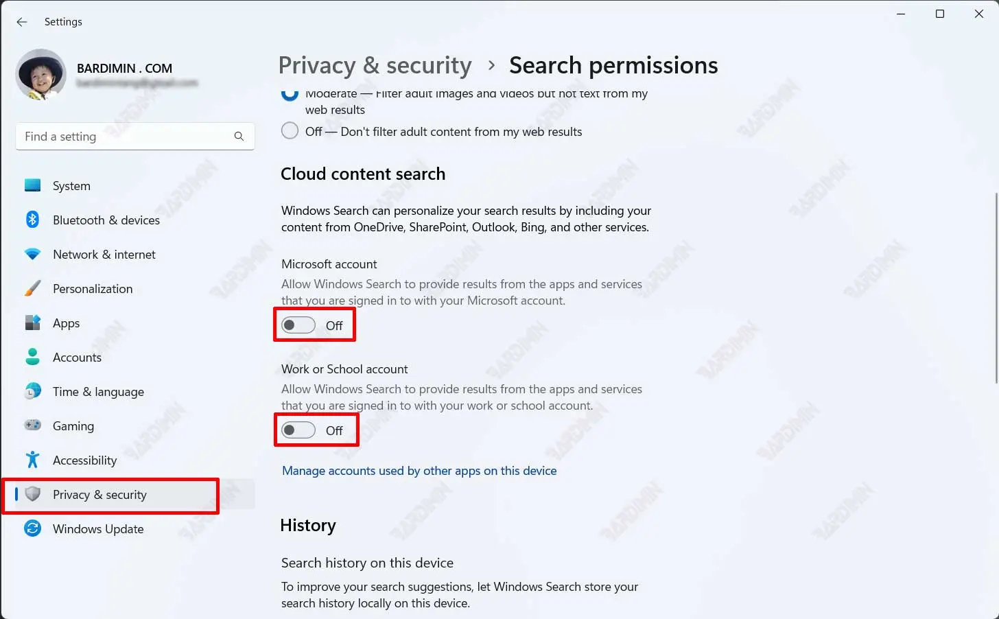 - In the Cloud content search section, slide the toggle to the Off position for both Microsoft account and Work or School account.