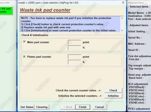 | Reset Waste Ink Counter | Resets the counter value in the printer firmware that records the estimated waste ink volume to the waste ink pad back to 0%. | Solves the error of the flashing LED light, locking the printer so that it can be used again. The main solution to the problem is “Waste Ink Pad Full”. | HIGH if done without paying attention to the physical condition of the waste pad. |