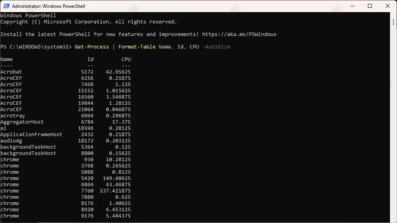 Get-Process | Format-Table Name, Id, CPU -AutoSizeThis output will display a list of processes with auto-trimmed columns.