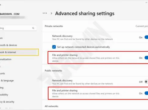 - Then select “Network & internet > Advanced network settings > Advanced sharing settings“. Then, on “File and printer sharing“, slide the switch button to the right to activate. Enable this feature on “Private Network” and “Public Network“.