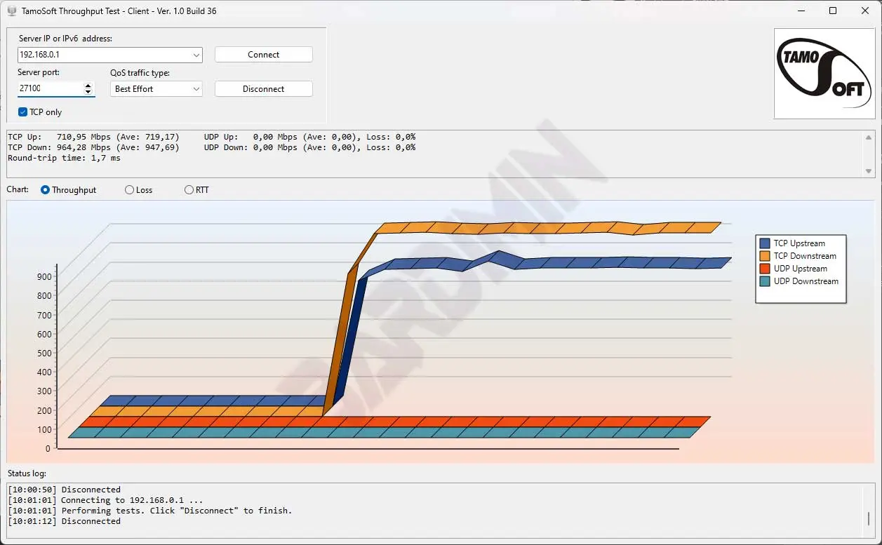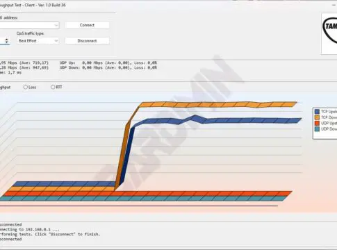 The TamoSoft Throughput Test works on TCP data streams and supports both IPv4 and IPv6 connections and allows users to evaluate network performance depending on Quality of Service (QoS) settings.