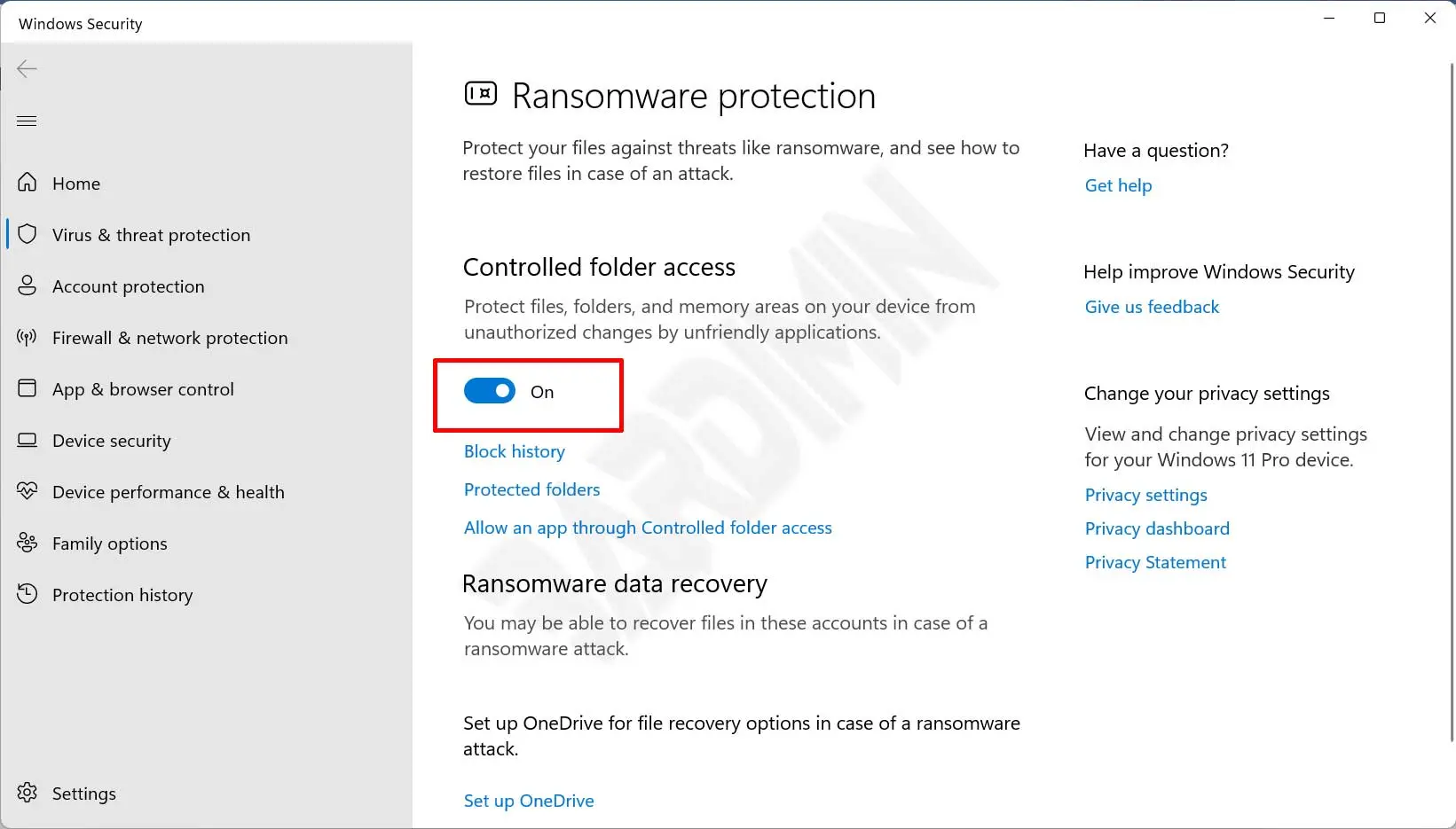 - A continuación, en » Controlled folder access » deslice el interruptor hacia la derecha para activarlo.