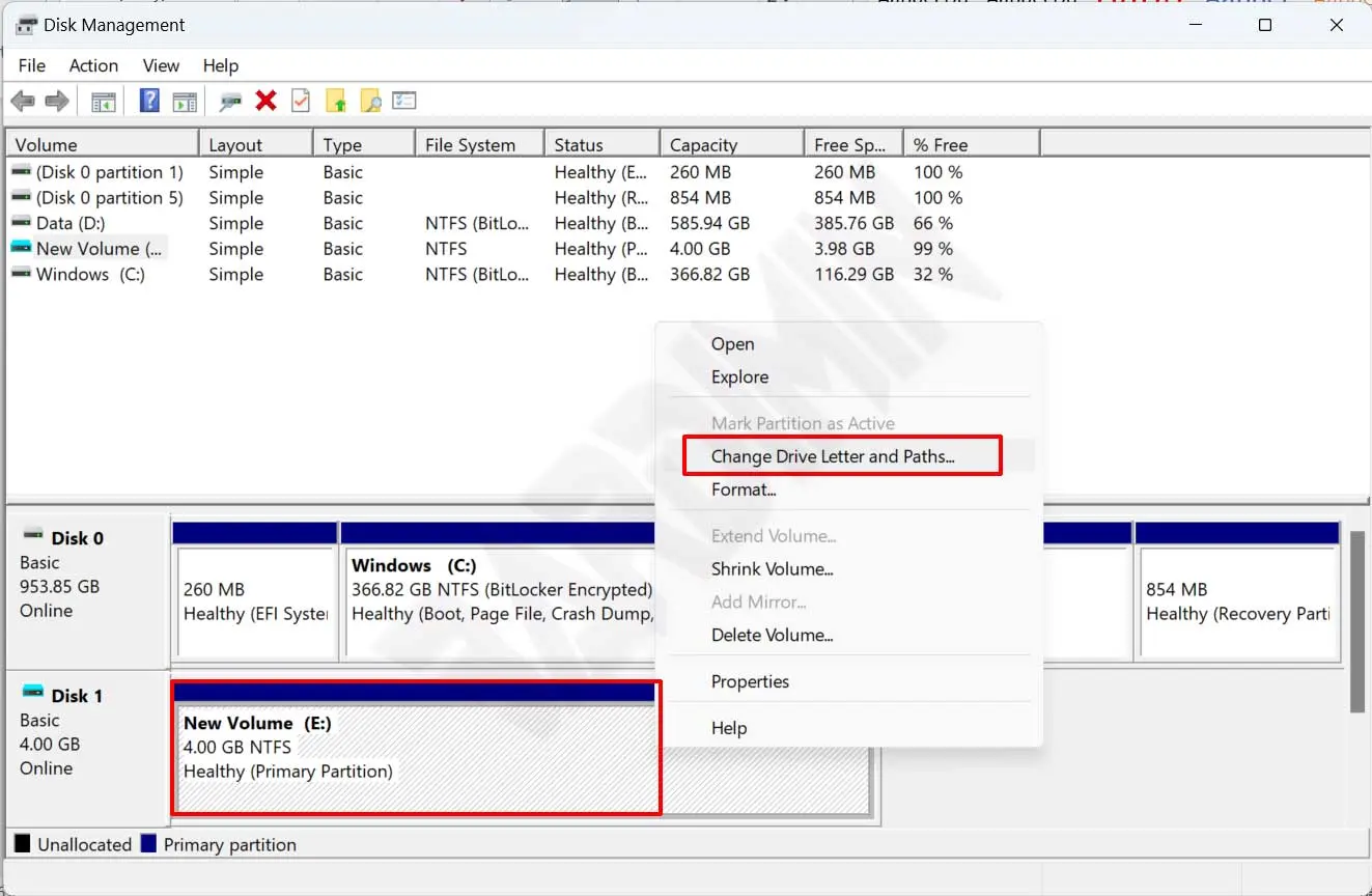 - A continuación, en la ventana de Administración de discos, seleccione la unidad que desea convertir. A continuación, haga clic con el botón derecho en la unidad y seleccione la opción «Change Drive Letter and Paths.
