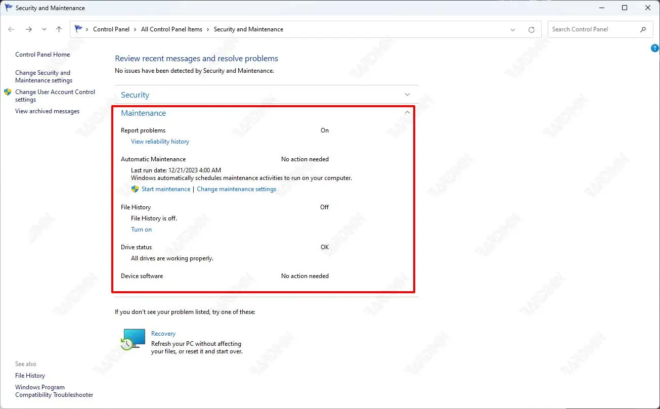 - En la ventana que aparece, haga clic en Cambiar la configuración de mantenimiento automático en la parte inferior.