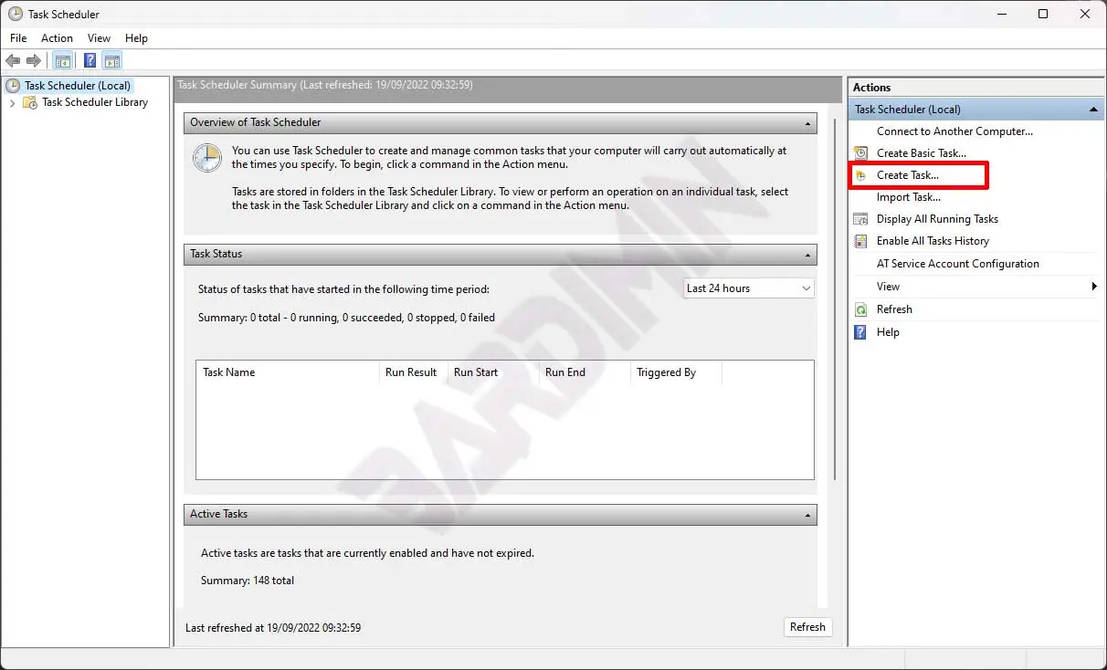 - Luego, en la aplicación “Task Scheduler”, haga clic en “Create Task” ubicado en la parte derecha del panel en el “Actions” group.