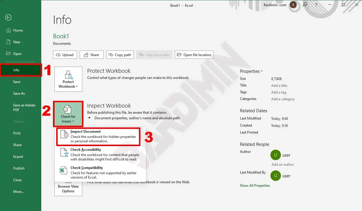 - A continuación, haga clic en el botón «Info». En la sección «Inspect Workbook», haga clic en el botón «Check for Issues». A continuación, seleccione la opción «Inspect Document». Si no ha guardado el archivo, aparecerá un aviso para que lo guarde primero.