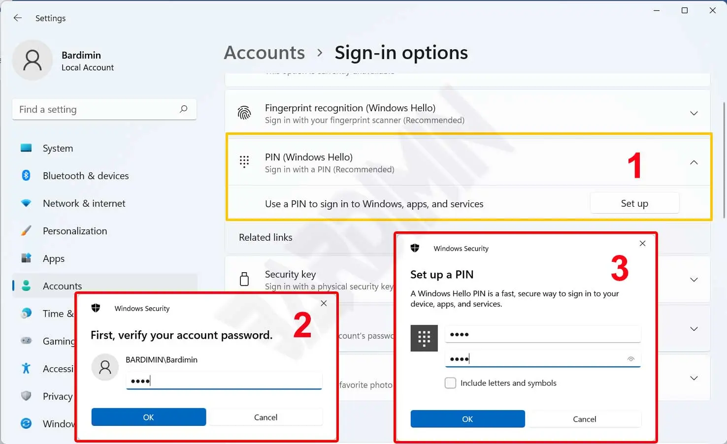 - Cree el «PIN» de Windows haciendo clic en el botón «Set up. A continuación, en la ventana que aparece, introduzca la contraseña de Windows y haga clic en el botón OK. A continuación, una nueva ventana aparecerá de nuevo y crear un PIN como desee.