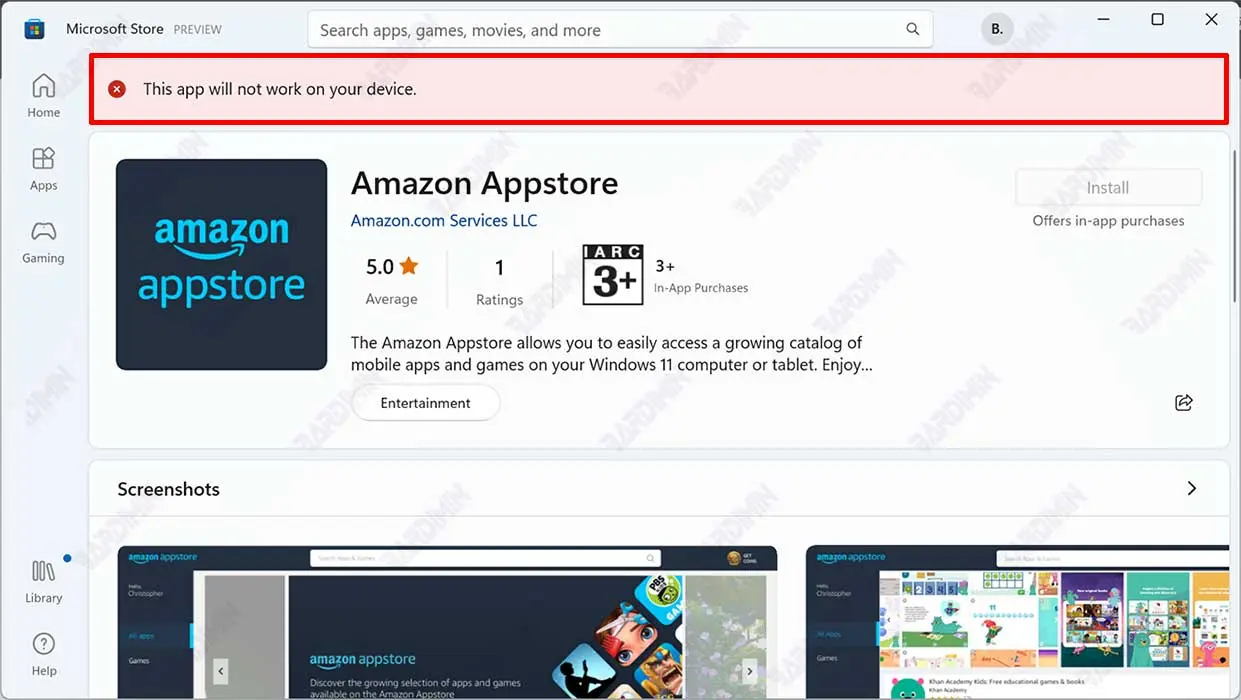 Puede instalar Amazon Appstore a través de Microsoft Store. Sin embargo, es posible que no pueda instalar Amazon Appstore en Windows mostrando el mensaje de error «Esta aplicación no funcionará en su dispositivo.