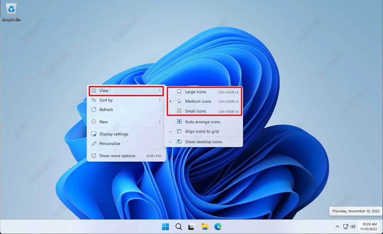 - A continuación, puede elegir el tamaño del escritorio de “Large Icons, Medium Icons, or Small Icons” según lo que necesite.