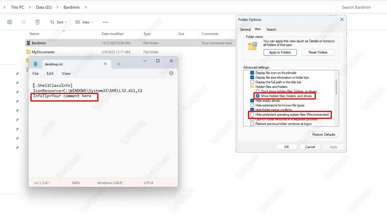 El segundo método para agregar comentarios en carpetas en Windows 11 es usar el archivo desktop.ini. Este archivo es un archivo de texto oculto que puede crear dentro de una carpeta para personalizar la apariencia y el comportamiento de la carpeta.