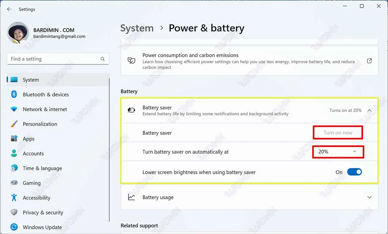 - Ensuite, sur le panneau de droite, cliquez sur “Battery saver” pour développer et voir ses options de paramètres.