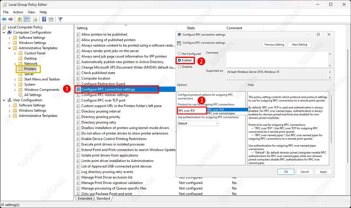 Les administrateurs ont la possibilité de personnaliser les communications liées à l’impression. À l’aide de la stratégie de groupe ou du Registre Windows, les administrateurs peuvent modifier les paramètres par défaut. Cela inclut la conversion du protocole de communication de l’imprimante en RPC sur canaux nommés et la configuration du serveur spouleur pour écouter également la communication RPC sur canaux nommés.