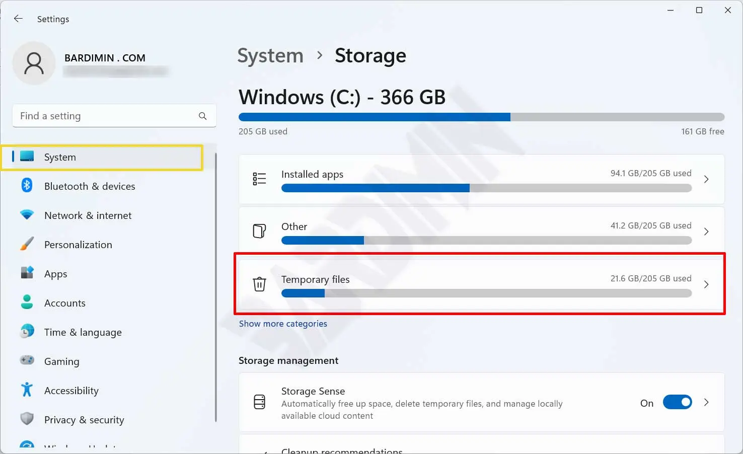 - Naviguez et sélectionnez » System > Storage « . Ensuite, dans le volet de droite, sélectionnez-le et cliquez sur » Temporary files « .