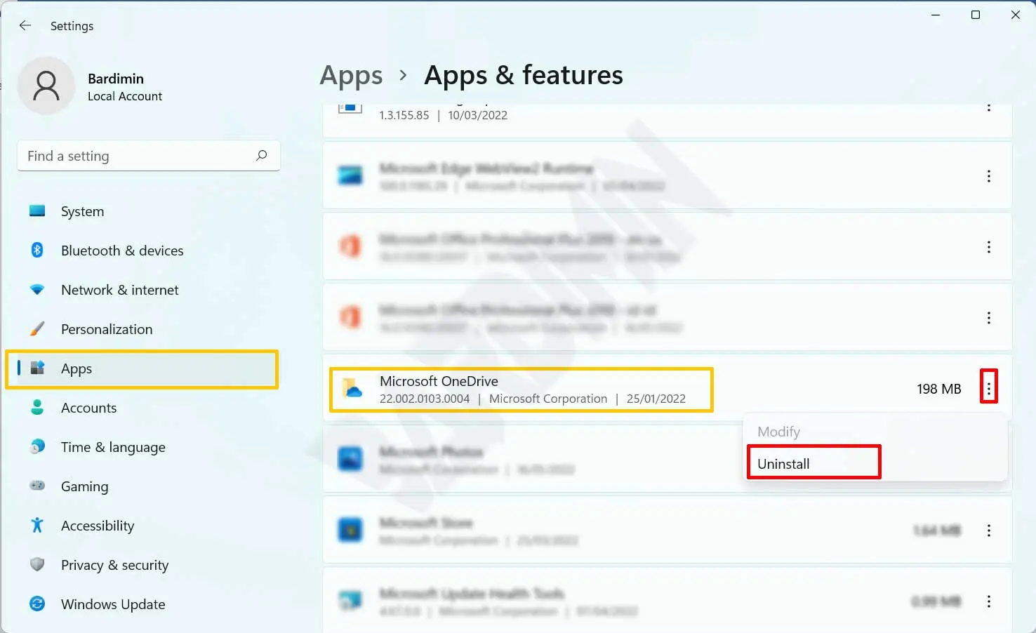 Ouvrez « Settings » ou avec le raccourci clavier ( Win + I ). Cliquez ensuite sur « Apps >> Apps & Features ». Dans le volet de droite, balayez vers le bas jusqu’à ce que vous trouviez « Microsoft OneDrive ». Cliquez ensuite sur les trois points à droite pour afficher les options. Sélectionnez « Uninstall » et Windows vous demandera de confirmer. Cliquez sur le bouton « Uninstall » pour poursuivre la désinstallation de OneDrive.
