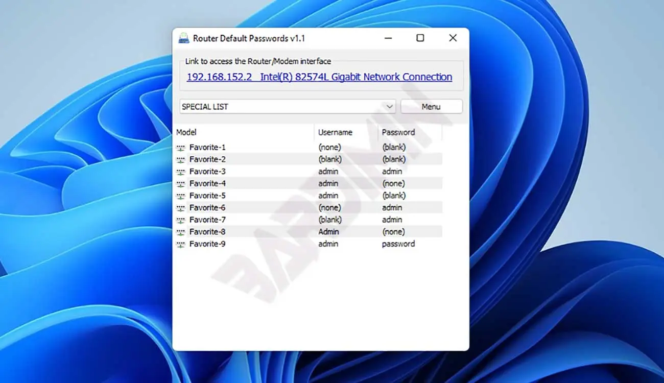 Router Default Passwords est une application portable qui permet de trouver l’adresse de la passerelle par défaut ainsi que l’utilisateur et le mot de passe par défaut du routeur.