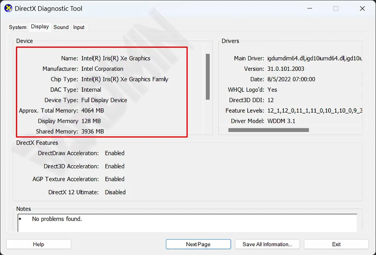 - Sélectionnez ensuite l’onglet « Display ». Dans la section « Device », vous obtiendrez les informations clés de la carte graphique, telles que le nom du GPU, la quantité de mémoire, le chipset utilisé, etc.