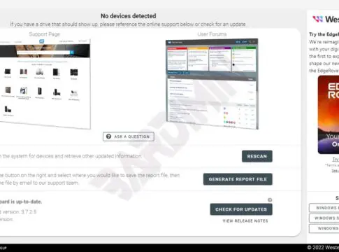 Western Digital Dashboard comprend des outils pour l’analyse des disques (y compris le modèle de disque, la capacité, la version du micrologiciel et les attributs SMART) et les mises à jour du micrologiciel.