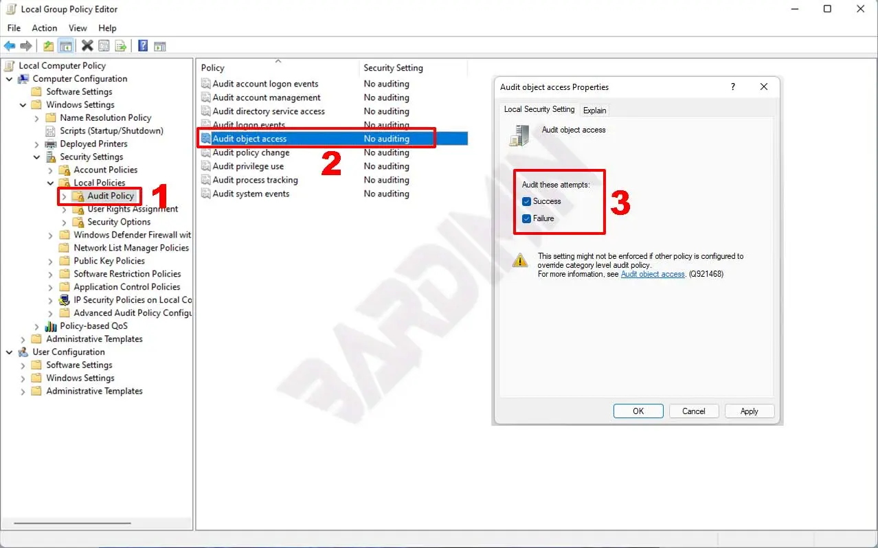 - Dans la fenêtre « Audit object access Properties », cochez toutes les options « Success » et « Failure » pour auditer chaque tentative.