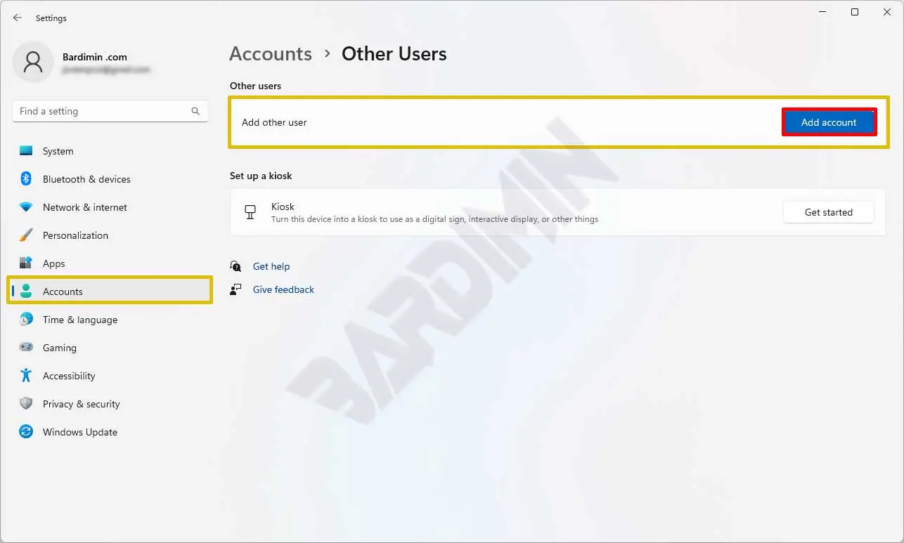 - Arahkan ke “Accounts > Other users”. Kemudian pada “Add other user”, klik tombol “Add account”.