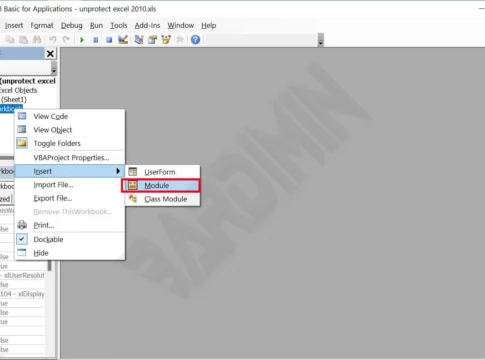 - Setelah jendela Visual Basic Editor terbuka, kemudian klik “ThisWorkbook > Insert > Module”.