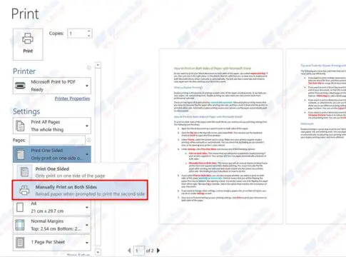 - Manually Print on Both Sides. Ini berarti Anda akan melakukan manual duplex printing, jika printer Anda tidak mendukung otomatis duplex printing. Anda harus membalik kertas secara manual setelah mencetak satu sisi, dan kemudian memasukkannya kembali ke printer untuk mencetak sisi lainnya. Word akan memberi Anda petunjuk tentang cara melakukannya.