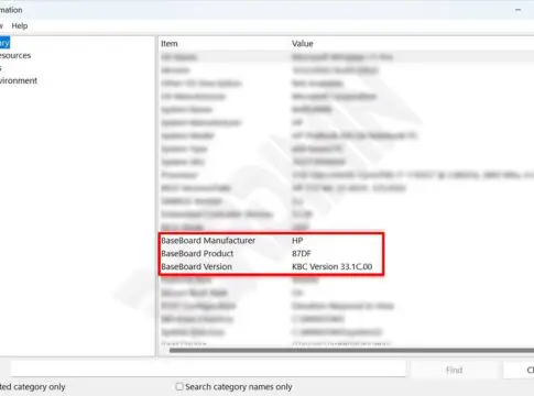 - Lihat pada informasi detail “Baseboard” (lihat gambar). Anda akan mendapatkan informasi pabrikan pembuat, produk dan versi motherboard.
