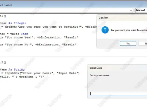 Dua fitur utama yang mendukung interaksi ini adalah Message Box (MsgBox) dan Input Box (InputBox). MsgBox berfungsi untuk menampilkan pesan atau meminta konfirmasi dari pengguna, sedangkan InputBox memungkinkan pengguna untuk memasukkan data yang akan digunakan dalam kode VBA. Keduanya sangat bermanfaat dalam berbagai situasi, seperti menampilkan peringatan sebelum menghapus data, meminta pengguna untuk memasukkan angka dalam perhitungan otomatis, atau menampilkan laporan hasil dari proses makro.