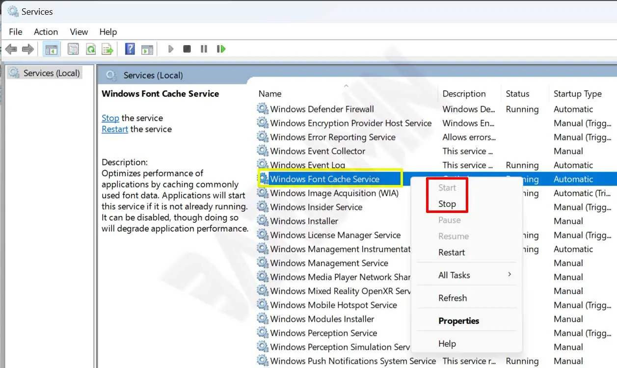 - Hidupkan kembali service tersebut dengan cara klik kanan dan pilih opsi “Start”. Hal ini akan membangun kembali cache font.
