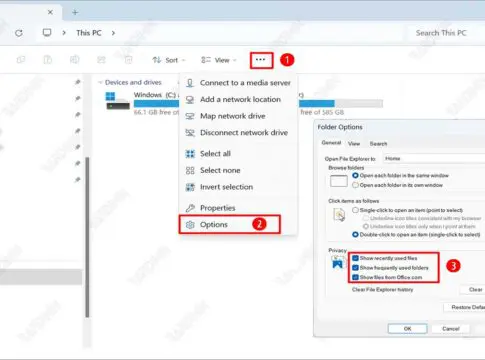 - Di bawah bagian Privacy, Anda dapat melihat dua kotak centang yang bertuliskan Show recently used files dan Show frequently used folders.