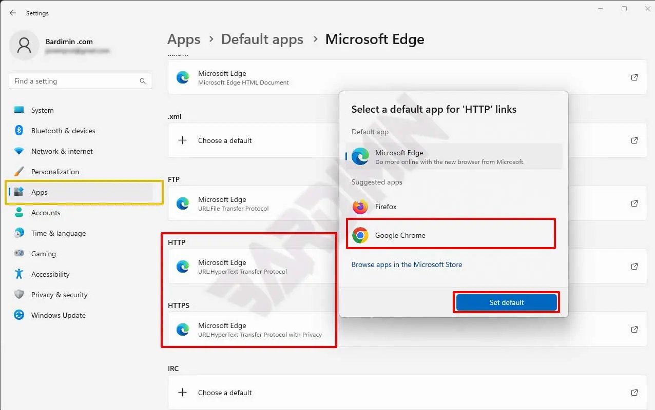- Setelah itu cari “HTTP” dan “HTTPS” dengan menggeser ke bawah. Kemudian klik Microsoft Edge untuk mengubah defaultnya.