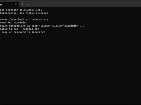 Untuk menguji password di Windows dapat Anda lakukan melalui Command Prompt (CMD). Dengan menggunakan baris perintah Runas, Anda dapat menjalankan alat dan program tertentu dengan nama pengguna yang berbeda dengan yang digunakan untuk masuk ke komputer secara interaktif. Utilitas akan meminta kata sandi, jika kata sandi yang benar telah diberikan, notepad akan diluncurkan.