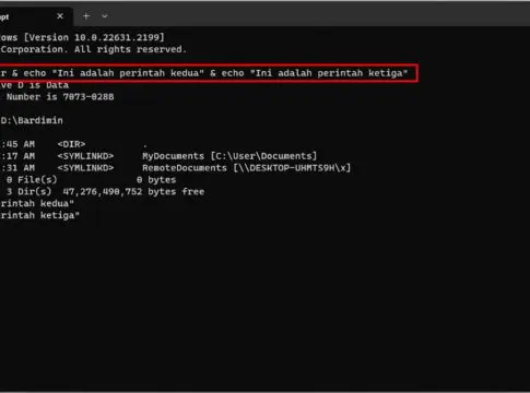 Untuk memastikan bahwa perintah echo “Ini adalah perintah kedua” hanya dijalankan jika perintah dir berhasil, Anda dapat menggunakan Simbol && sebagai berikut: