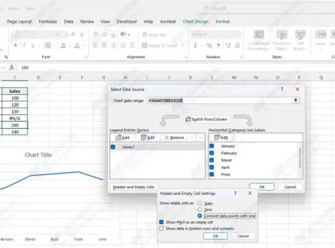 - Pada jendela Hidden and Empty Cell Settings, pilih salah satu opsi berikut untuk menentukan bagaimana grafik Anda menangani nilai 0: