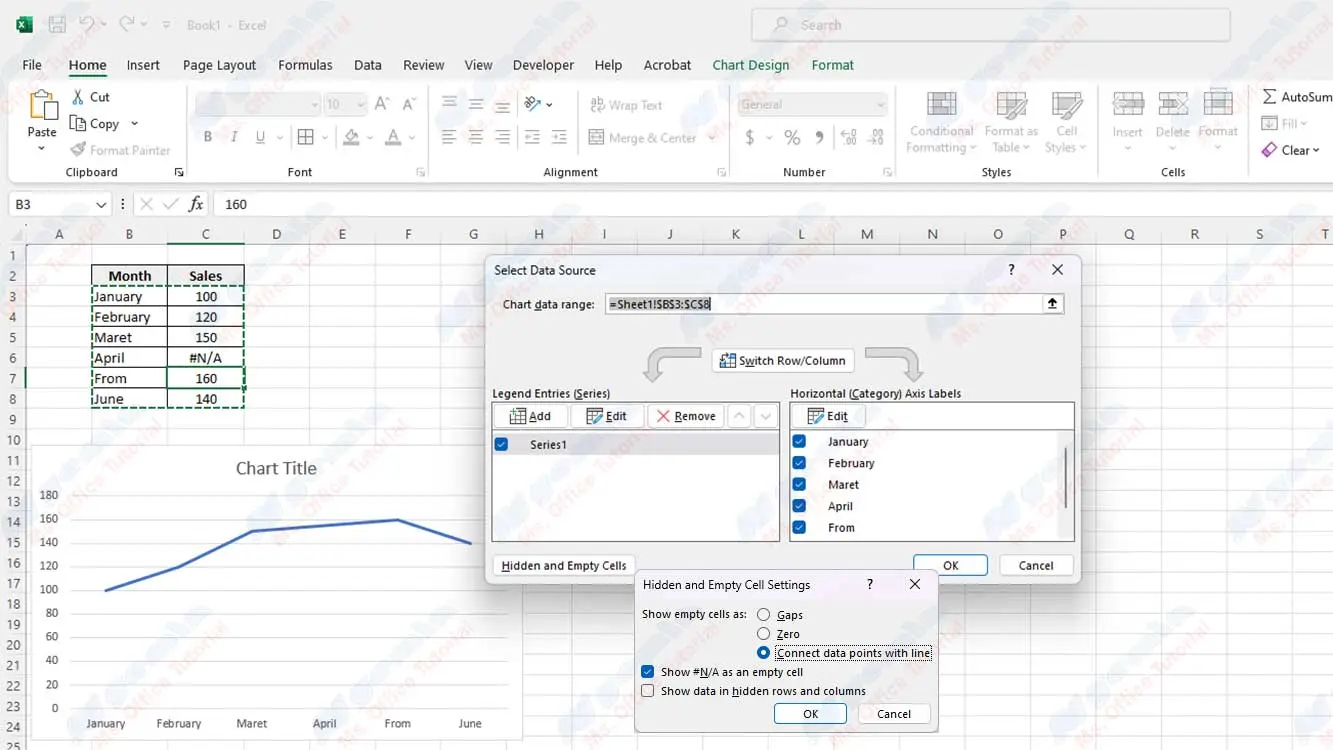 - Pada jendela Select Data Source, klik tombol Hidden and Empty Cells di pojok kiri bawah.