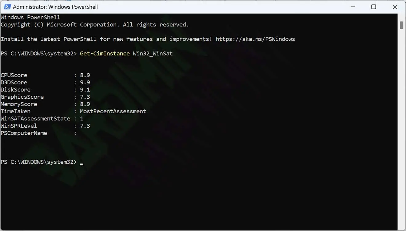 Anda juga bisa menggunakan PowerShell untuk menjalankan Windows System Assessment Tool (WinSAT) untuk mendapatkan skor kinerja perangkat.