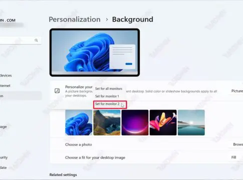 Untuk mengatur wallpaper berbeda untuk setiap monitor, Anda harus memilih monitor yang ingin Anda ubah wallpaper-nya. Misalnya, jika Anda ingin mengatur wallpaper berbeda untuk monitor kedua, Anda harus mengklik kanan pada gambar yang Anda pilih dan memilih Monitor 2.