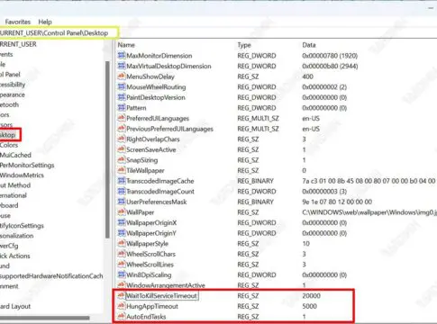 - HungAppTimeout : Menentukan berapa lama sistem menunggu hingga proses pengguna berakhir sebagai respons terhadap perintah tombol End Task di Task Manager. Jika ambang batas ini terlampaui, kotak dialog End Task muncul, yang menyatakan bahwa proses tidak merespons. Nilai defaultnya 5000 ms (5 detik).