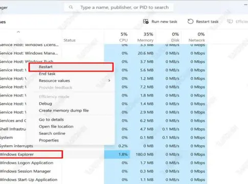 - Klik pada Windows Explorer, lalu klik tombol Restart di sudut kanan bawah Task Manager. Atau, Anda bisa juga klik kanan pada Windows Explorer dan pilih Restart.