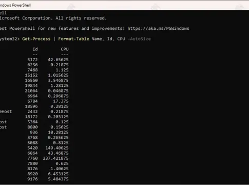 Get-Process | Format-Table Name, Id, CPU -AutoSizeOutput ini akan menampilkan daftar proses dengan kolom yang dirapikan otomatis.