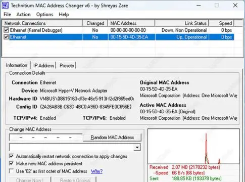 Setiap NIC memiliki alamat MAC yang dikodekan oleh pabrikan ke sirkuitnya. Driver Windows menggunakan alamat MAC hard-coded ini untuk mengakses Ethernet Network (LAN). Melewati alamat MAC hard-coded awal, utilitas ini dapat menetapkan alamat MAC baru ke NIC Anda. Setiap toolkit pakar keamanan harus menyertakan Technitium MAC Address Changer.
