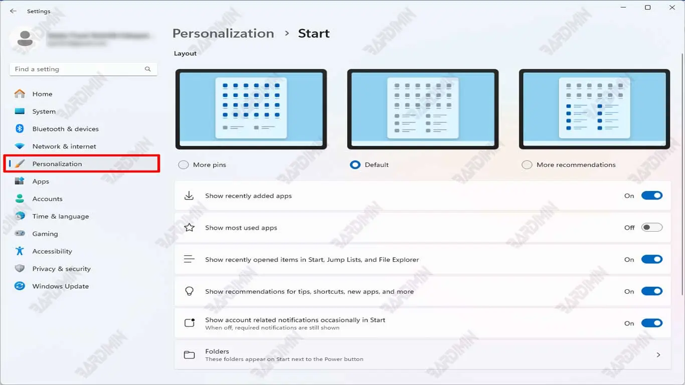 - Menambah Folder: Di bagian bawah menu Start settings, klik pada Folders untuk memilih folder yang ingin ditampilkan di Menu Start.